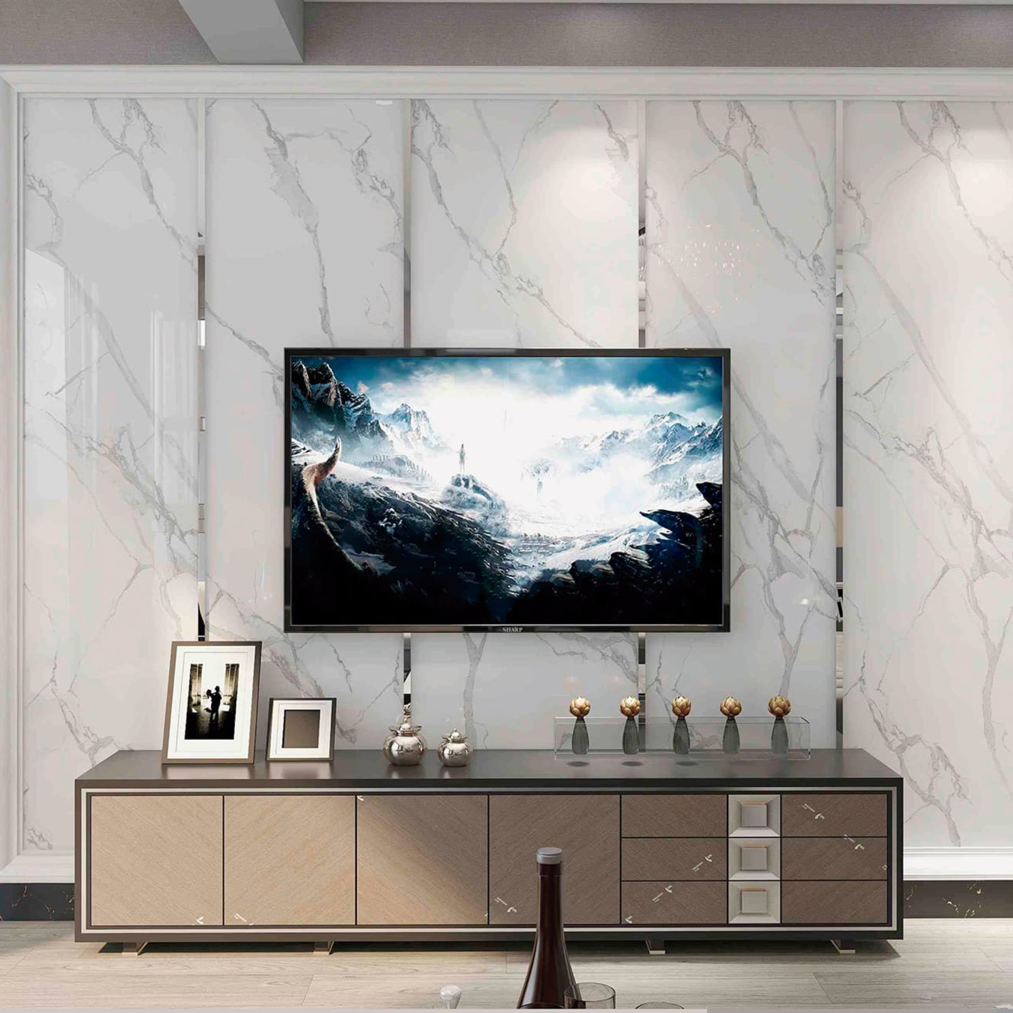 Los paneles Marble Composite Satinados Calacatta Satin reproducen la elegancia del mármol Calacatta con su fondo blanco luminoso y vetas marcadas en tonos grises y dorados, en una versión de acabado mate satinado que aporta calidez, equilibrio visual y sofisticación atemporal. Ideales para revestimientos interiores, estos paneles ofrecen una solución decorativa de alto impacto estético sin las complicaciones del mármol natural.